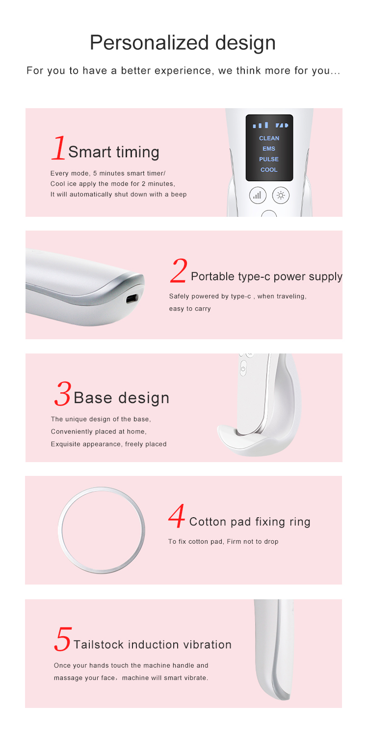 4. You can choose from four skin care modes to help you deeply clean pores, promote skin absorption of nutrients, eliminate skin fatigue, restore skin elasticity, and make skin more delicate and smooth.